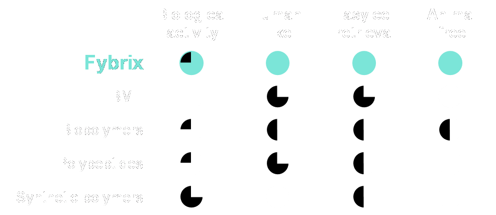 Fybrix is a unique material. It combines the reproducibility and customizability of synthetic materials with the properties of biological materials. Compared to other synthetic gels, Fybrix has excellent biological properties. Compared to biological materials, Fybrix benefits from a controlled composition and easy cell retrieval.
